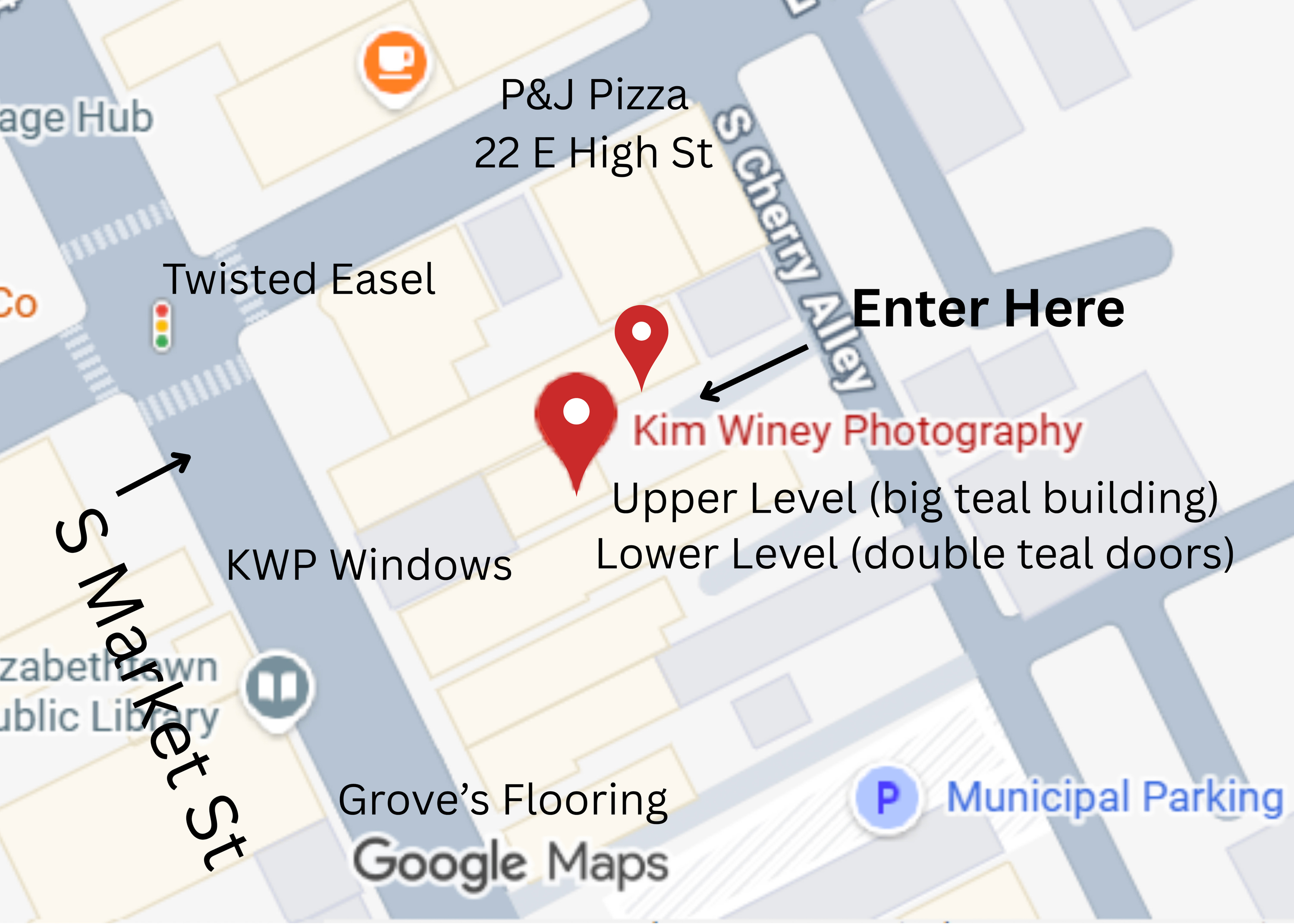 We're actually not far from Etown's square, but still... we're practically invisible. To locate The Creative Spaces of Kim Winey Photography, look for us right behind P&J Pizza Elizabethtown, on S Cherry Alley, Elizabethtown, PA. This is a one-way street, when you enter from 22 E High St, we're in the FIRST private parking lot, on the RIGHT.